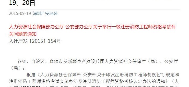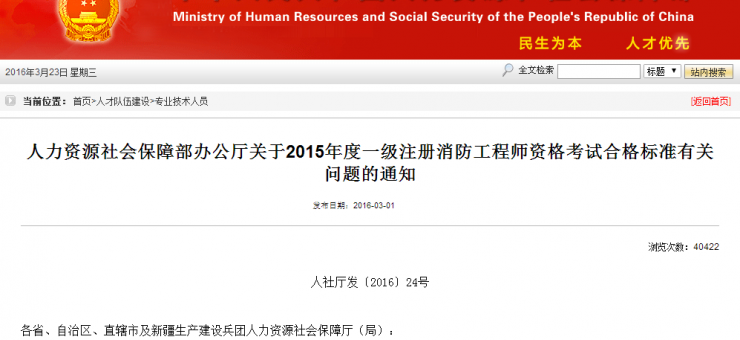 2016年03月01日,人力资源社会保障部办公厅2015年度一级注册消防工程师资格考试合格标准有关问题的通知。