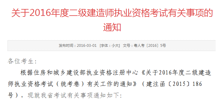 2016年03月01日,广东人事考试网发布《关于2016年度二级建造师执业资格考试有关事项的通知》:2016年度二级建造师考试报名已经开始